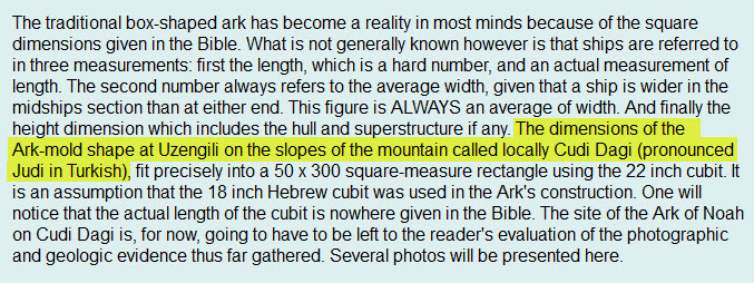 The dimensions of the Ark-mold shape at Uzengili on the slopes of the mountain called locally Cudi Dagi (pronounced Judi in Turkish), fit precisely into a 50 x 300 square-measure rectangle using the 22 inch cubit.