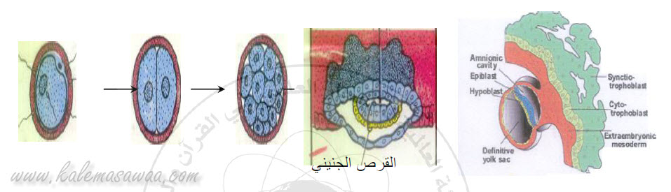 مراحل تكوين الجنين : يبدأ تكون الجنين عندما يحدث تلقيح البويضة بحيوان منوي، حيث يدخل الحيوان المنوي إلي البويضة وتصبح مخصبة ويتكون نتيجة لذلك الزيجوت، ينقسم الزيجوت إلي خليتين وكل خلية تنقسم إلي خليتين وهكذا يستمر الانقسام وتكاثر الخلايا في الجنين حتى يصبح الجنين عبارة عن قرص embryonic disc مكون من طبقتين وذلك في اليوم الرابع عشر هما: